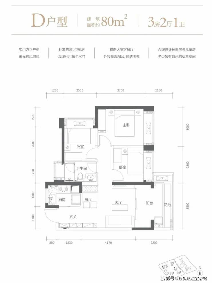 85㎡的3房2厅1卫,设计的是经典竖厅格局,客厅3.5米开间,进门玄关,LDKB一体化设计,动静分区,3个卧室分别做到了主卧12.9㎡/次卧8.96㎡/次卧8.16㎡(包含墙体飘窗),L型厨房,卫生间干湿分离,得房率72.48%(不含赠送),有朝东向或西向。