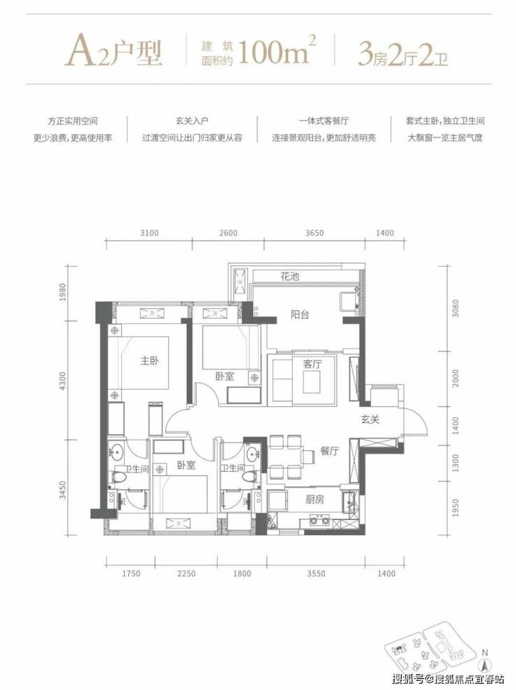 100㎡的3房2厅2卫,A2户型,设计的是竖厅格局,客厅3.65米开间,进门玄关,LDKB一体化设计,动静分区,3个卧室分别做到了主卧15.19㎡/次卧8.32㎡/次卧7.76㎡(包含墙体飘窗),L型厨房,卫生间干湿分离,得房率72.63%(不含赠送),阳台主朝东北向。