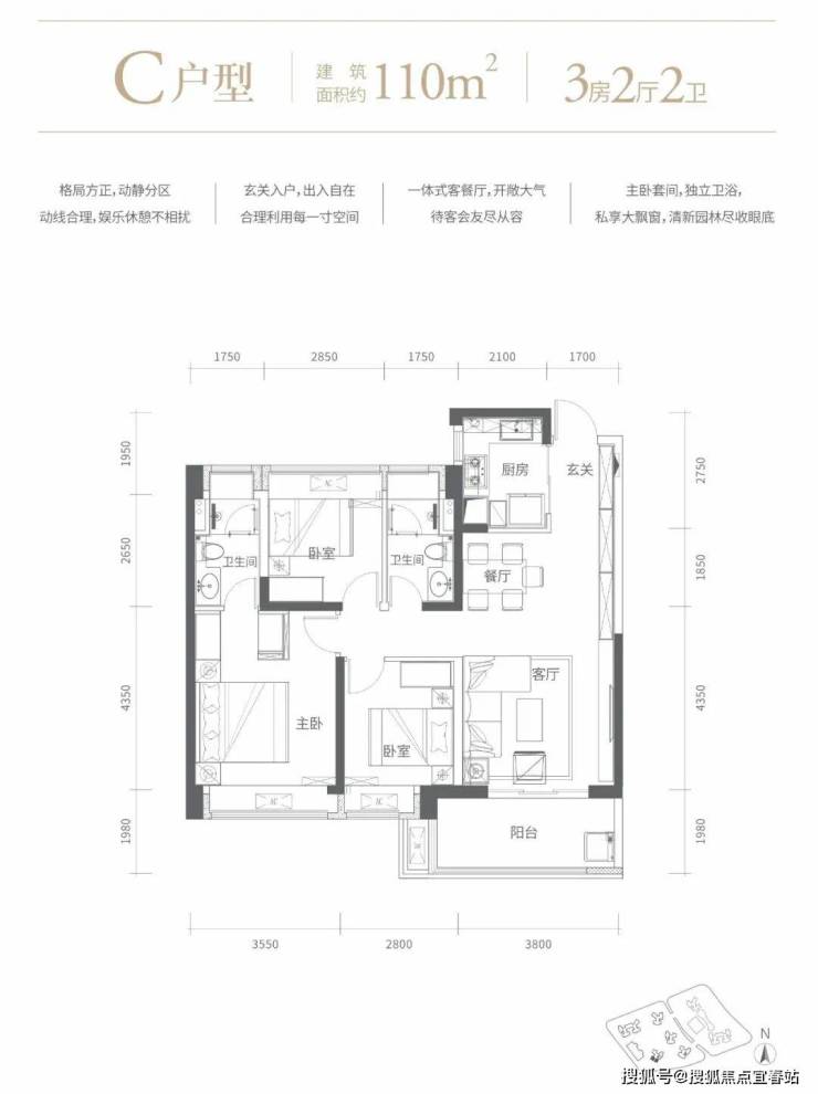 110㎡的3房2厅2卫,A2户型,设计的是经典竖厅格局,客厅3.8米开间,进门玄关,LDKB一体化设计,动静分区,三开间朝南,3个卧室分别做到了主卧17.57㎡/次卧9.26㎡/次卧8.96㎡(包含墙体飘窗),L型厨房,卫生间干湿分离,得房率73.97%(不含赠送),西南朝向。