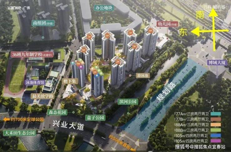 万科·檐屿城项目计划首推1、9栋,货量预计325套,计划推出建面约77-88-98-105㎡三至四房高实用率户型