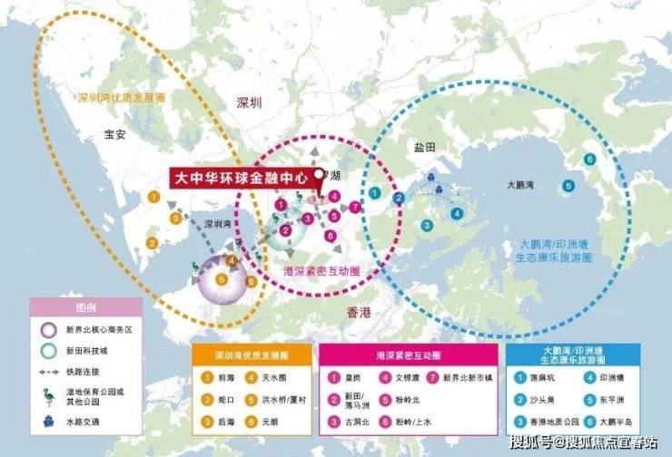 香港特区行政长官林郑月娥,于《2021年香港施政报告》中提出,香港将元朗及北区占地约300平方公里的土地,对标“维港都会区”建设为人口约250万人宜居、宜业、宜游的“北部都会区”,实现真正意义上的港深融合。其规划的“双城三圈”,其中“双城”是香港和深圳,“三圈”即由西至东分别为深圳湾优质发展圈、港深紧密互动圈、大鹏湾/印洲塘生态康乐旅游圈。罗湖口岸作为港深融合桥头堡,同时位于“港深紧密互动圈”中心,【大中华环球金融中心】当之无愧的双城C位。