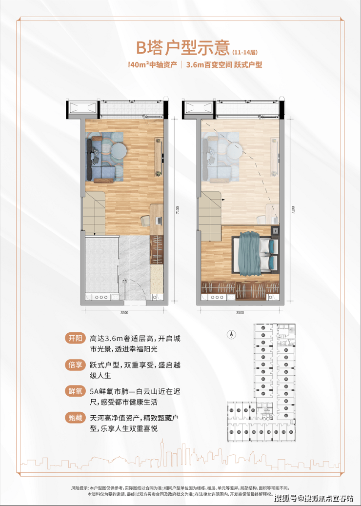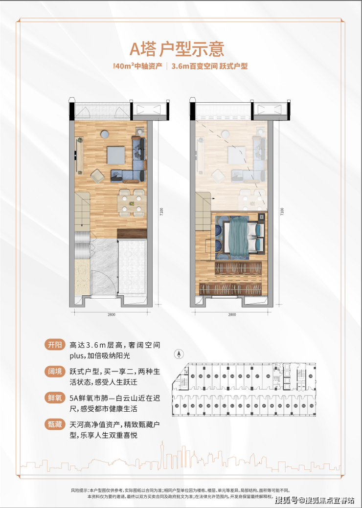 :36-43㎡酒店行政公馆、31-54㎡中轴精品空间,3.4-3.6米层高,适用于居住、办公、投资。