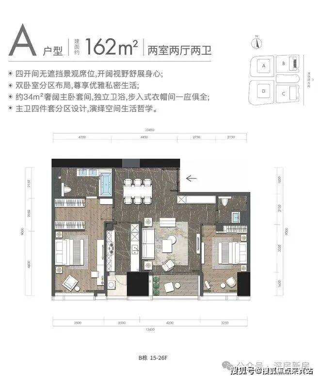 A户型:约162㎡2房2厅2卫:B栋15-26F(中区),东朝向