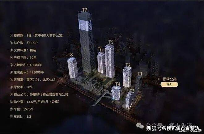 总共8栋,分为南北区。北区分为:T1写字楼、T2、T3、T4公寓。南区分为:T5、T6、T8公寓,T7为环球商务中心。