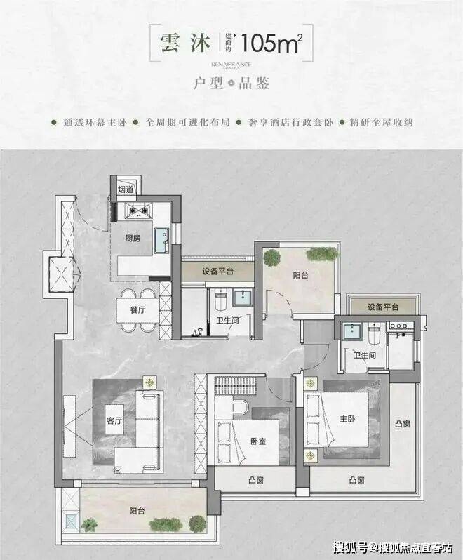 105㎡的3房2厅2卫,设计的是经典竖厅格局,进门入户玄关,超大宽面客厅5米开间,LDKB一体化,S墙设计预留冰箱卡槽位,三开间朝南,3个卧室分别做到了主卧16.62㎡/次卧11.31㎡/次卧7.28㎡(实测面积),U型厨房,卫生间干湿分离,还带2个设备平台,得房率约96.1-96.69%(包含赠送),东南或东北朝向。