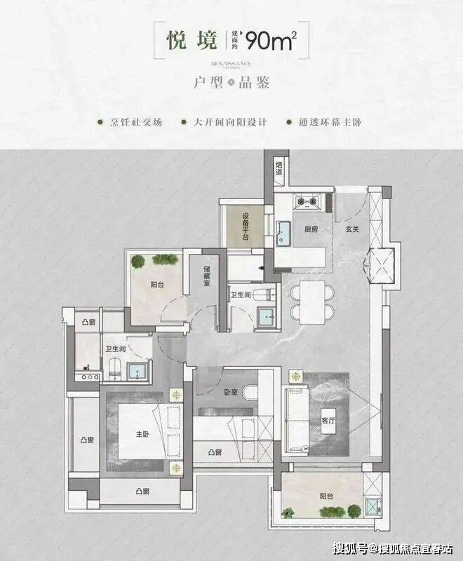 90㎡的3房2厅2卫,设计的是经典竖厅格局,进门入户玄关,LDKB一体化,S墙设计预留冰箱卡槽位,三开间朝南,U型厨房,卫生间干湿分离,还带1个设备平台,得房率约94.1-95.74%(包含赠送),西南朝向。