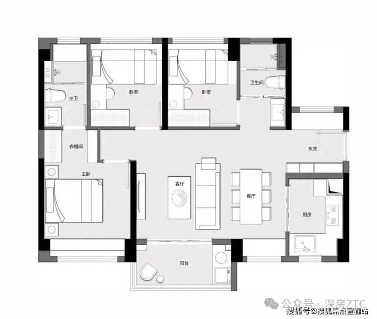 户型方正大气,宽敞横厅设计;U型奢阔厨房;轩敞主卧带独立衣帽间、卫生间;270度观景阳台,至阔南向面宽。