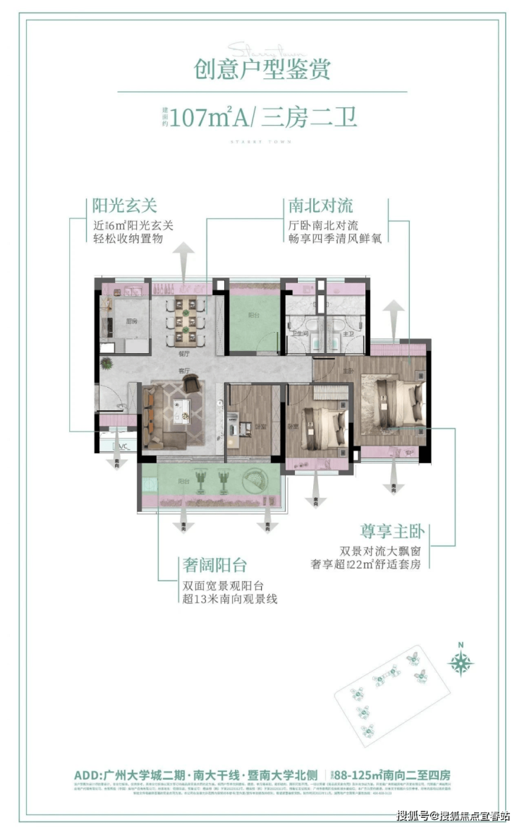 户型设计合理,如107㎡四房两厅两卫户型,横厅设计,五开间朝南,客厅餐厅及主卧对南北流。