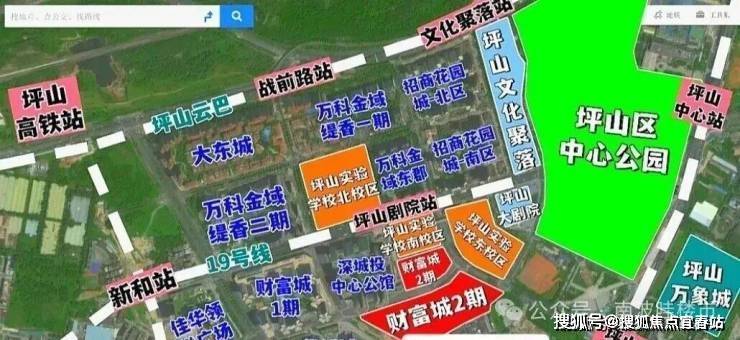 财富城2期所在的区位是整个坪山最核心的地段,汇聚了高铁+14/16号线双地铁+坪山实验学校+坪山中心公园+坪山天虹商场+坪山区政府+坪山体育中心+坪山图书馆,文艺馆等等,所有的市政配套基本都集中在这里,并且财富城2期也是该核心区域内唯一在售的新盘。