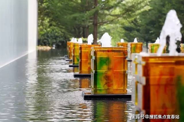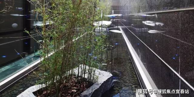右侧精致灯具长条阵列,造型设计源于古代玉琮,外方内圆,仪式庄重。涌泉出水,极富动感。