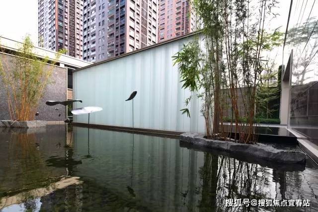 前行横向挡墙将视线压低,背景乔木柔化并勾勒出优美的天际线。驻足于静水之上的涌泉,同时这也是精致的灯具,点缀于深色的静水面与透光幕墙之间,彰显贵雅。