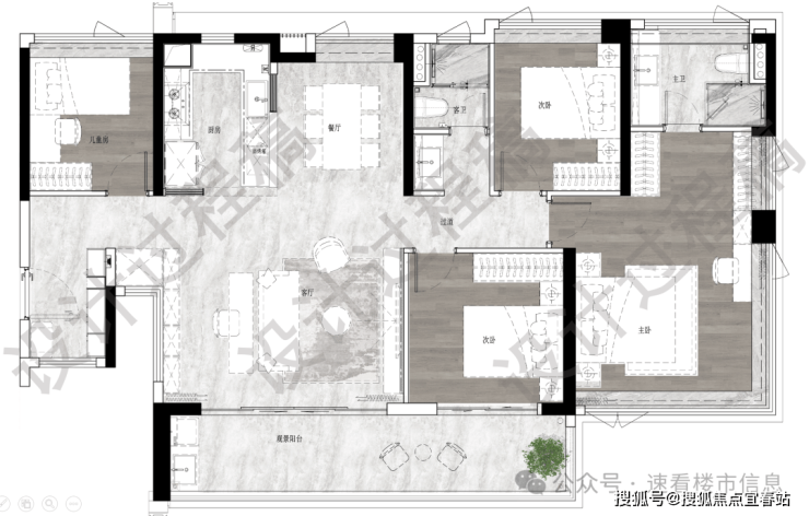 建面168平四房三卫,放大版的142平,做了双主套,适合三代同堂家庭,单边位,南北对流采光通风都非常好,约40平的大房厅,景观阳台开间约8.2米.