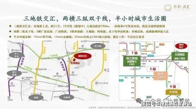 地铁方面,项目距离地铁21号线大观南路站约1.2公里,步行约20分钟,可1站换乘4号线,直达金融城、琶洲,4站到员村换乘5号线,快速接驳珠江新城。另外,未来规划中的19号线、37号线或将交汇于此,但落地尚需时日,因此短期内公共交通的便利性仍有不足。