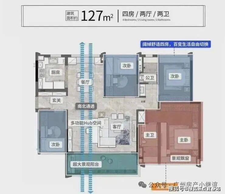 约95㎡四房两厅两卫五开间朝南,自在追逐清风暖阳超阔瞰景阳台,四时美景入怀南北对流设计,四季享新鲜空气奢阔私密主卧套房,升阶生活仪式感