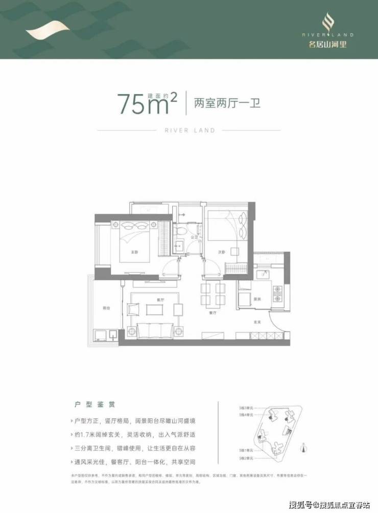 『水岸生活』 建面约75-141㎡ 精质舒居总建面约48万㎡山河大城崛起,匠筑城市封面级立面,毫米级精工雕琢空间。室内设计以人为本,s型冰箱位、LDK+G一体化设计更显奢阔,户型方正,户户朝南,大面积采光,带IMAX宽景阳台,俯瞰山河,诠释生活的至臻格调。