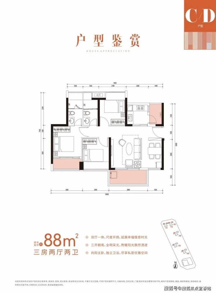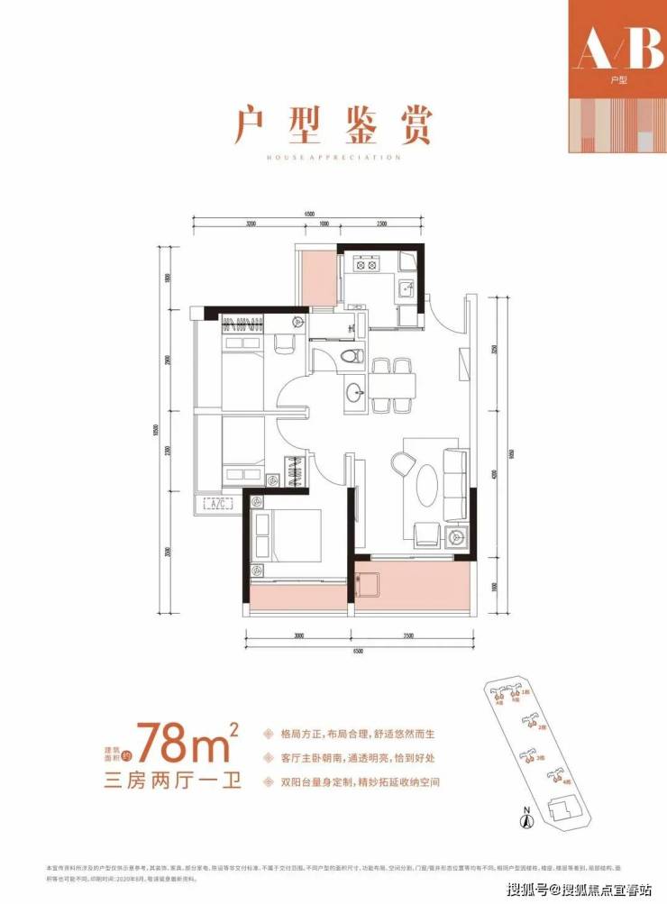 规划总占地面积为24830㎡,建筑面积为97092㎡,用地呈长方形状,楼栋一字排开,建成有4栋住宅和1栋18层酒店和商业楼,其中1栋分为AB两座共28层,2-4栋为独栋塔楼共32层,5栋18层酒店。规划总户数有563套,其中3房(90㎡以下)共有461套房源,共有3个户型面积,分别为78㎡3房、88㎡3房和118㎡4房,主力户型是78㎡。