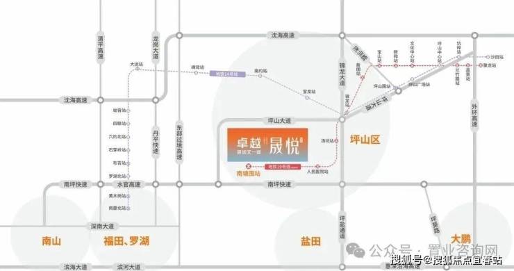 交通配套:超集快速畅达:南坪快速、东部过境通道、坪盐通道,3条快速速抵罗湖福田,约15km盐田沙头角、约25km罗湖莲塘/香港、约35km福田、约40km南山