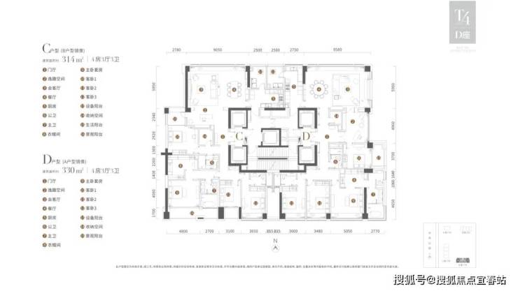 B/C户型:330m²四房三厅四卫,南北通透(卧室全南向)