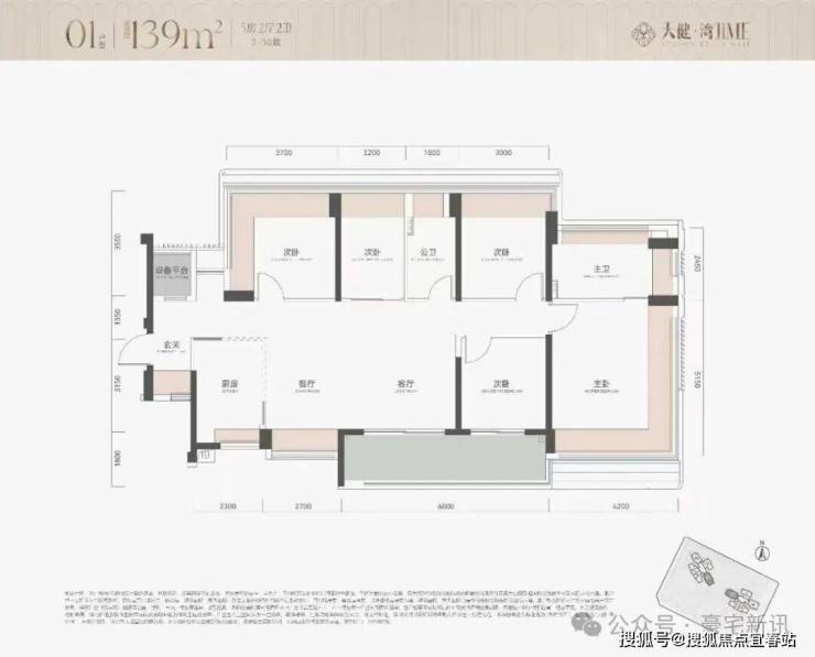 最后是01的139平5房2卫户型,可以看成是放大版的04,也在边户,比较通透的横厅设计,朝南看海,主卧尺度比较大,洗手间带双台盆和浴缸以及步入式衣帽间: