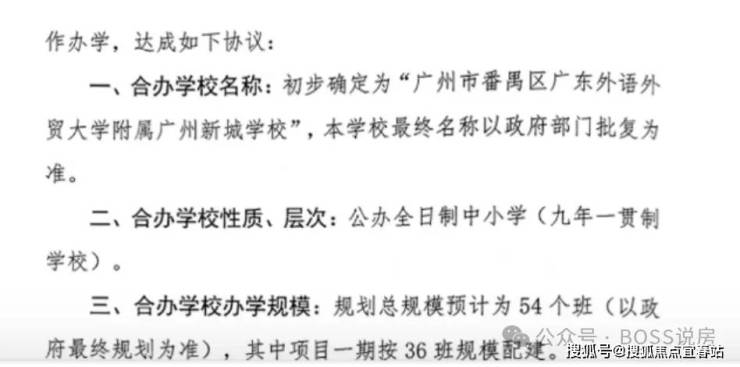 项目自带一所 36 班九年制学校,目前已经官宣广外附,已于2025年3月21日和番禺区教育局、广东外语外贸大学签约,学校名为广东外语外贸大学附属广州新城学校(暂定名)。