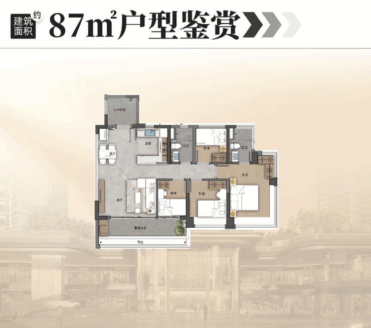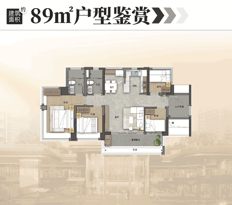 87平米做到四房两卫,也是自带入户花园,阳台宽度达到6.3米,如果不要求三房,客厅封窗处理,豪宅即视感不就来了!