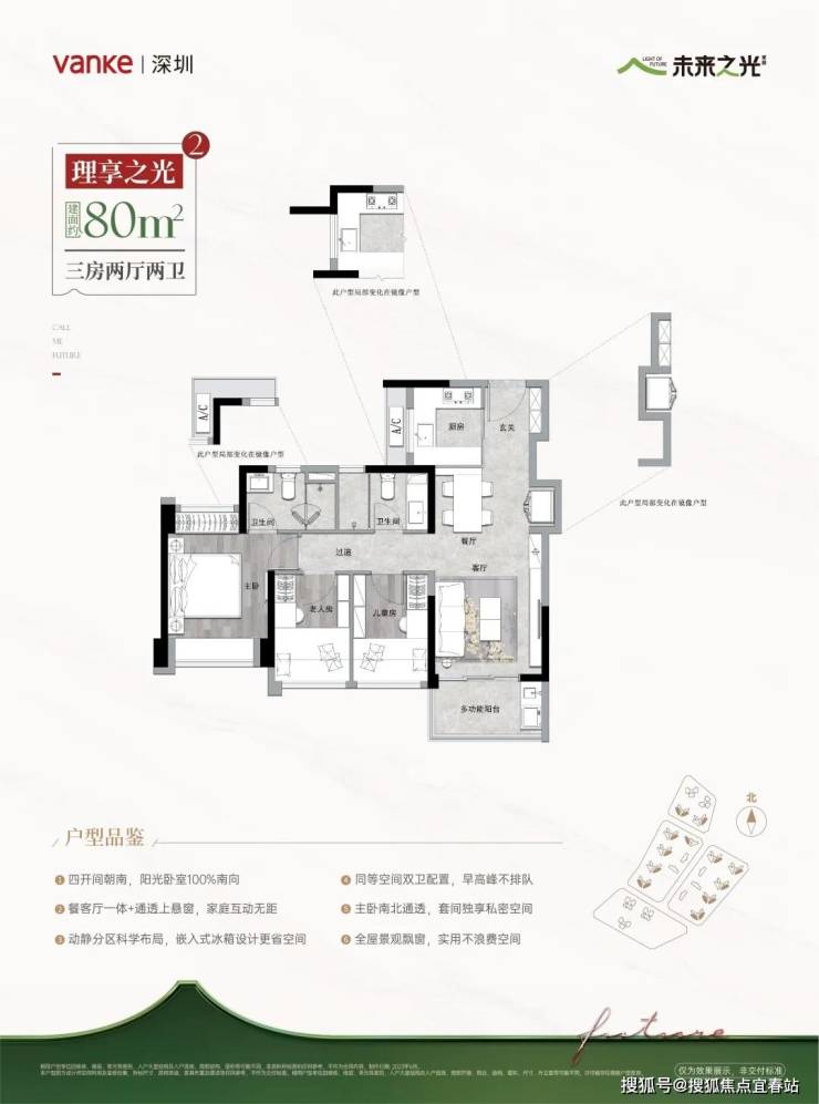 这种户型有两种设计,80平米通透户型,西北和东北两种朝向,虽说是通透设计,不过朝向确实差点意思,厨房还有细微的差别,通透设计户型厨房是 L 型,位置也不一样;80平米普通户型是东南朝向,阳台是 U 型设计。在深圳大家更加喜欢通透设计的户型
