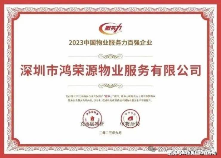 中国百强物业:鸿荣源物业为国家物业管理一级资质企业,2018-2023连续六年中国物业服务百强企业。