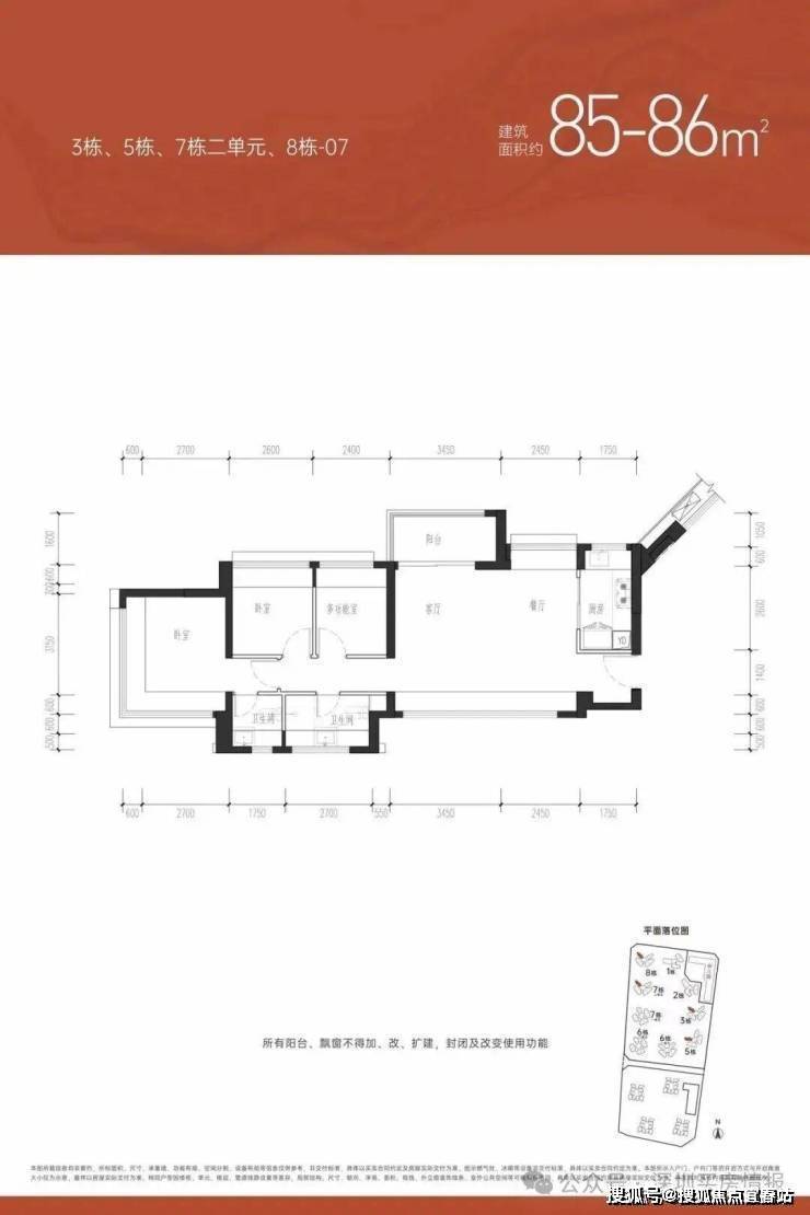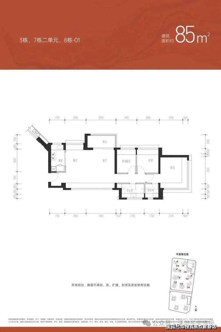 ①户型分析:小面积、低总价,最佳上车首选户型;全南向排布户型,多飘窗的设计,采光通风不错;户型方正,动静分区的设计注重隐私性;明厨明卫,三分离洗手间设计;②朝向:西南、东南向③视野:小区外围,临万丰路,看城市风景,施工建设区域【约85㎡三房两卫】户型分布:分布在7栋2单元、8栋、3栋,共710套,①户型分析:有横厅和竖厅两种户型,全屋7个飘窗、13米采光面,非常通透;预留超多收纳空间主卧双面采光,景观视野更开阔②朝向:东北、西北朝向③视野:社区花园和社区楼栋
