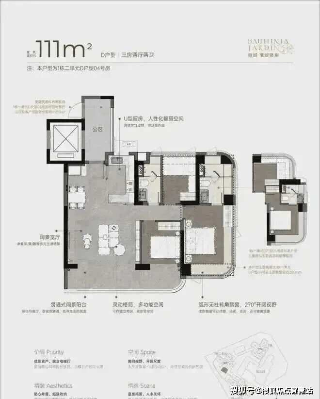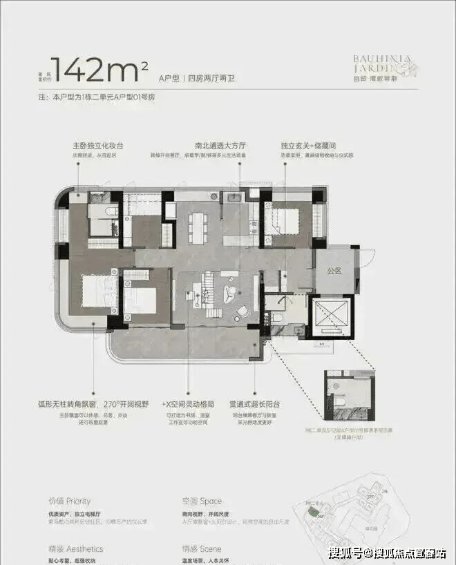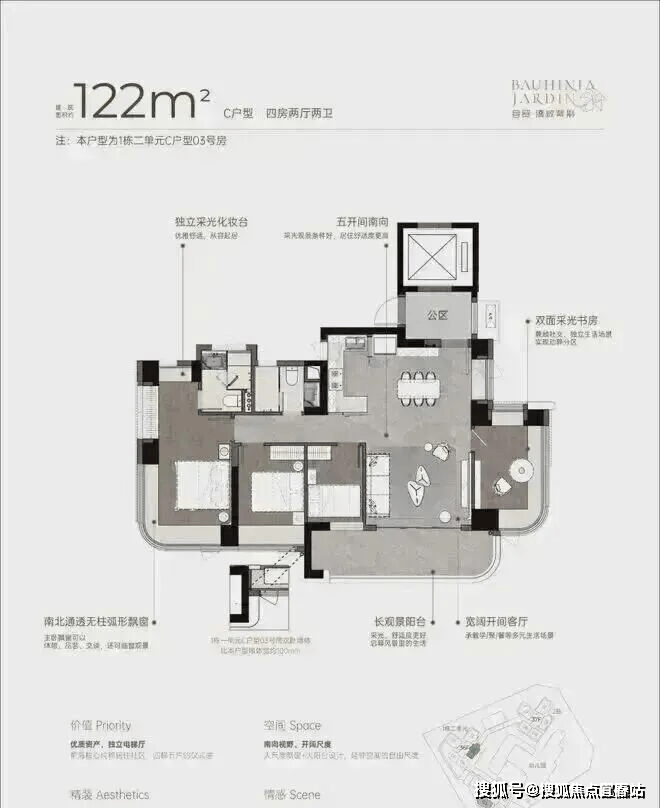 双龙抱珠户型,整个户型非常通透。书房分布于客厅另一侧,难得的双面采光+270°景观视野。主卧南北通透,景观面开阔。