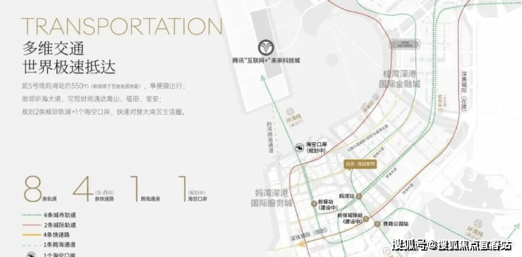 距5号线妈湾站约550m,毗邻听海大道,可快速通达南山、福田、宝安及大湾区生活圈。规划8条轨道(城际+城市)、4条快速路、1条跨海通道、1个海空口岸。