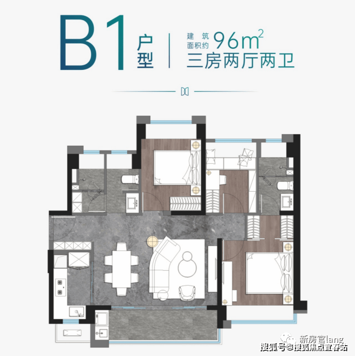 💎B1户型:建面约96㎡三房两厅两卫