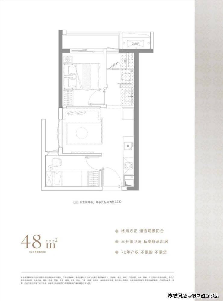 45-48平两房,主要特色是双卧室均有大面宽采光,明厨明卫,三分离卫浴设计,通透观景阳台提升空间感。