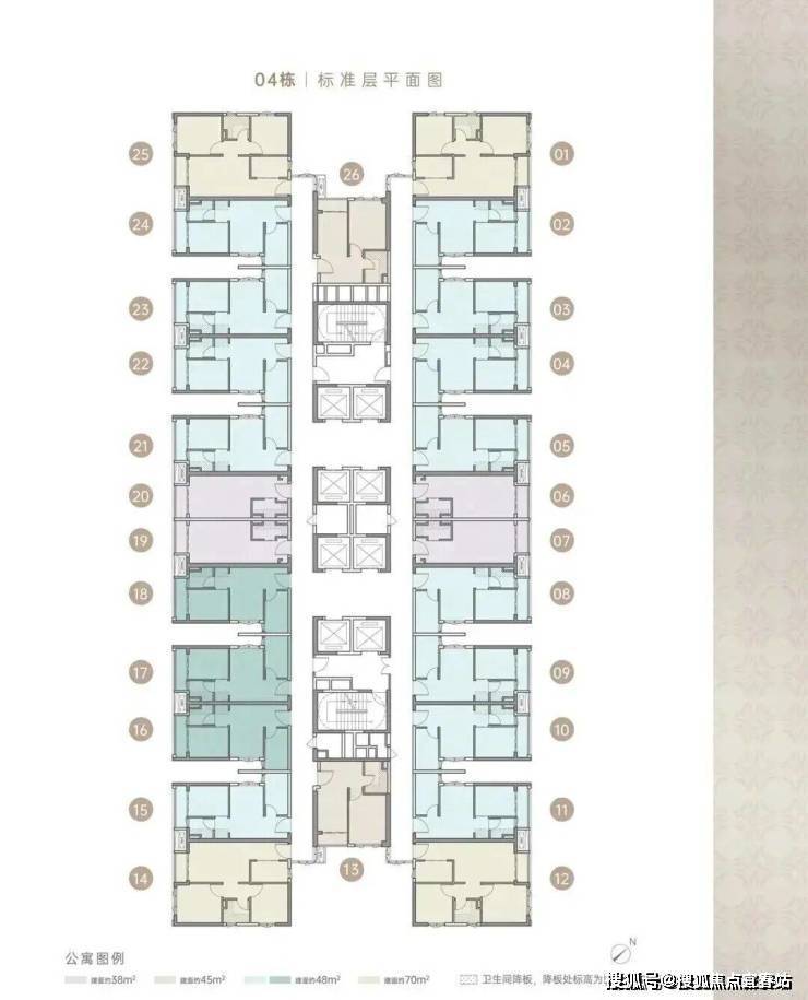 宸悦府的公寓产品38-70平1-2房,45F(1470户),3梯14户(部分楼栋8梯26户),类住宅设计。