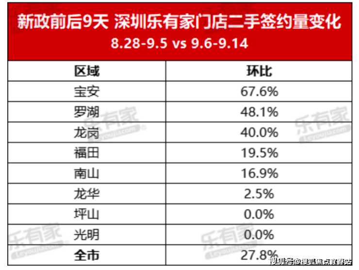 深圳乐有家研究中心数据显示,9月6日~9月14日期间,宝安的二手房签约量环比涨幅高达67.6%,而罗湖环比涨幅也达到了48.1%。