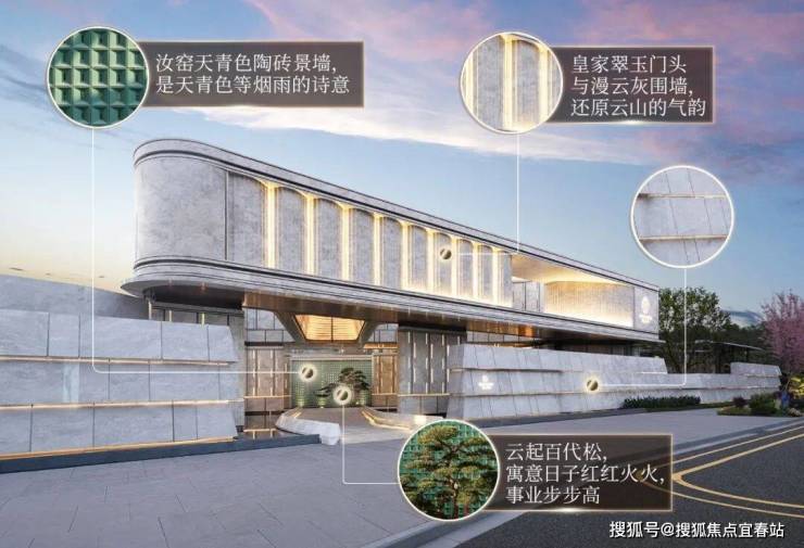 从主入口进入,迎面而来的云起百代松与汝窑天青色陶砖景墙,既有美好的寓意,也代表着生活的诗意。