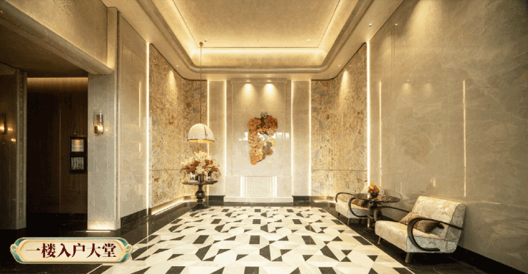 项目采用双大堂设计,负一楼的车马厅和一楼入户大堂已经实景呈现,将精致的艺术风格和用材用料,从地面延伸到地下。
