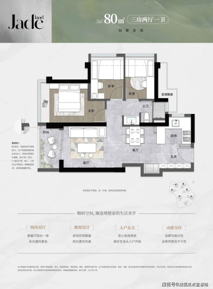 80㎡的3房2厅1卫,设计的是竖厅格局,客厅3.2米开间,LDKB一体化,S墙设计预留冰箱卡槽位,3个卧室分别做到了3米/2.4米/2.25米的宽度,U型厨房,卫生间三段式分离,全部是西北朝向。