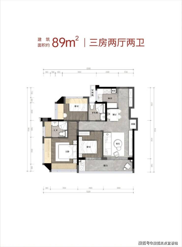 89㎡的3房2厅2卫,设计的是竖厅格局,客厅3.4米开间,LDKB一体化,S墙设计预留冰箱卡槽位,3个卧室分别做到了3.9米/2.9米/2.6米的宽度,客厅连接次卧出6.3米长的大阳台,L型厨房,卫生间干湿分离,有西北、西南或东南朝向。