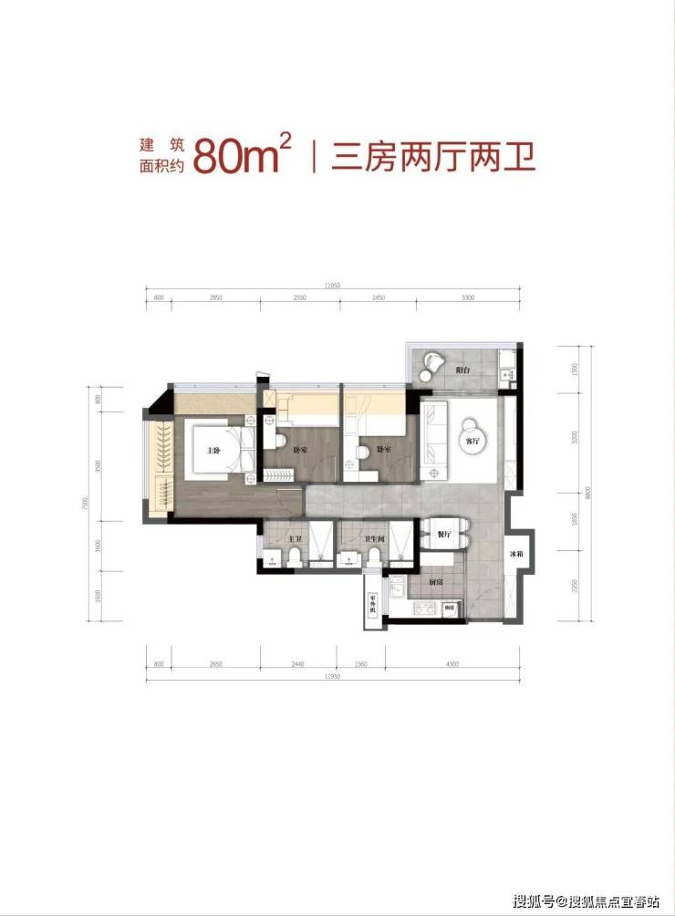80㎡的3房2厅2卫,设计的是竖厅格局,客厅3.3米开间,LDKB一体化,S墙设计预留冰箱卡槽位,3个卧室分别做到了3.65米/2.55米/2.45米的宽度,L型厨房,卫生间干湿分离,有朝东北向或正东朝向。