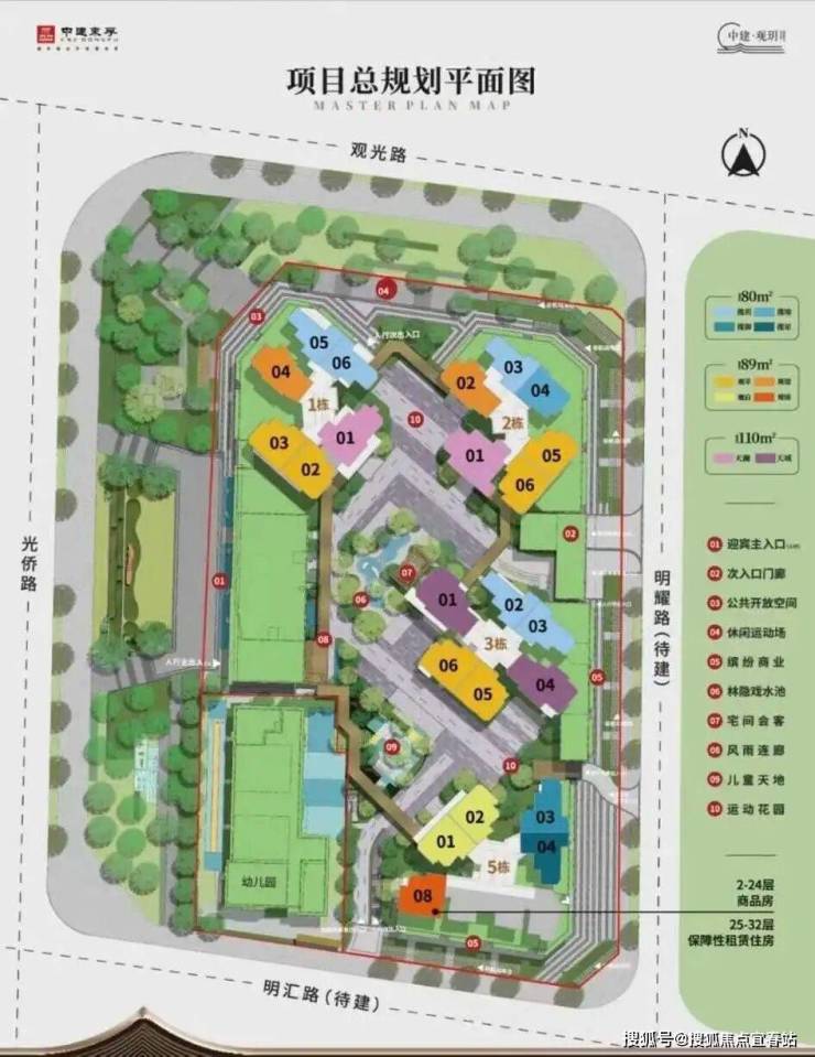 中建观玥总占地面积约1.43万㎡,总建筑面积约11.49万㎡,计容建筑面积约7.91万㎡,容积率5.4,绿化率35.1%,共由4栋总高32-33F住宅组成,其中1/2/3栋商品房33F,5栋商品房+保障房32F,4栋是1所6班制幼儿园。