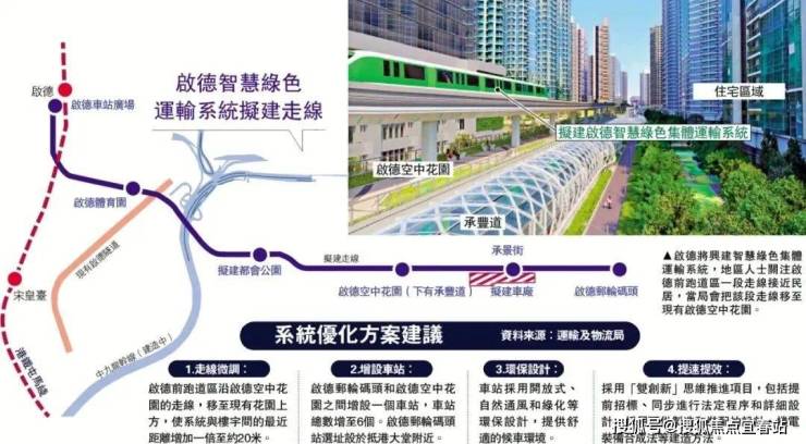 政府还规划了“智慧绿色集体运输”系统,预计2031年落成。总长3.5公里,规划有6个站,快速连接启德邮轮码头,令区域内交通系统更加多元便利。