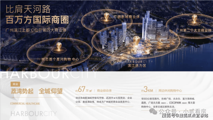 拥8大业态城市综合体,规划有大型商业,企业总部,星级酒店,滨江公园,文化艺术中心,教育医疗配套,高端居住及TOD立体交通于一体,广州唯一最全配套大体量的综合体。