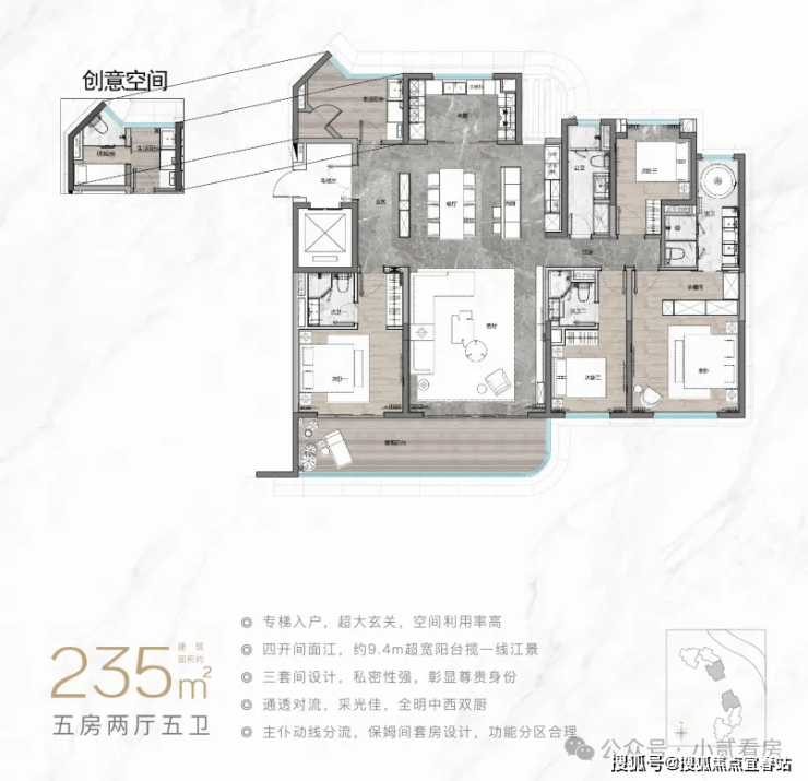 目前楼王产品璇湾壹号面积段为184-255㎡的4至5房,瞰江面最高18.3米,最高270°观景面,临江约100米,户型图如下: