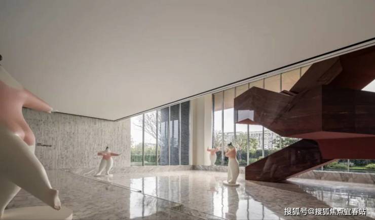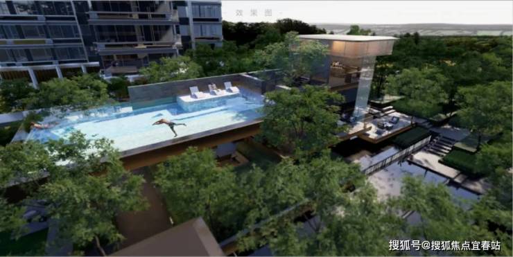 上层空间设计了两个独特的休闲空间:漂浮云厅空间和无边泳池空间。下层空间,穿过景墙之后的游廊可以来到的一个宽大的亲水卡座。整体空间提供了丰富社交空间的多种形式,这里会成为社区的活动场所。