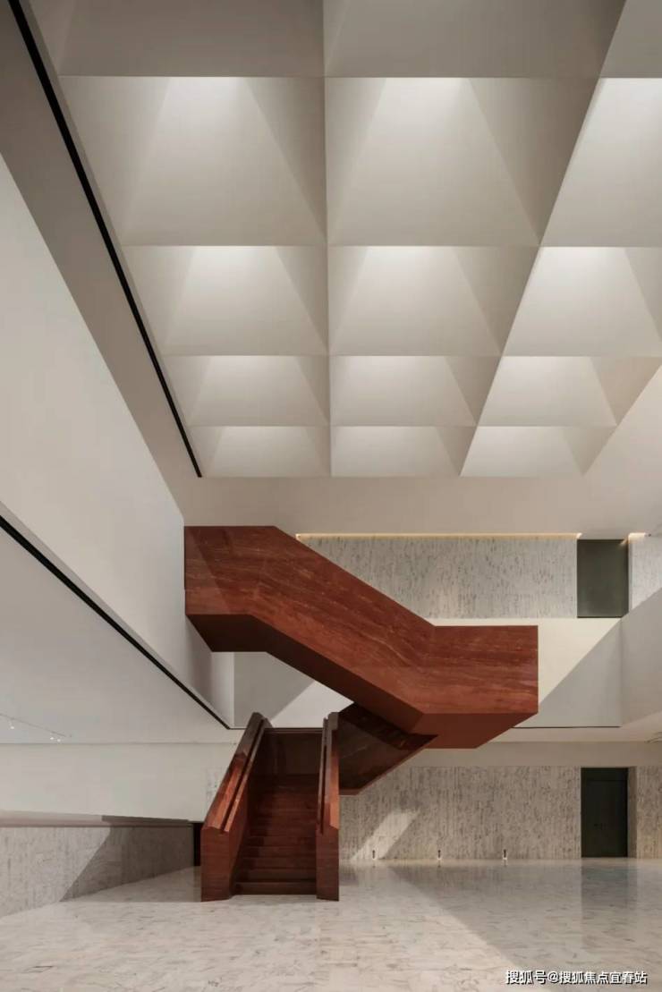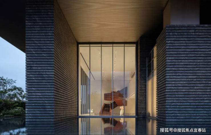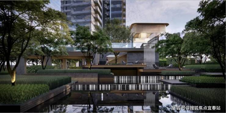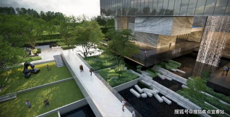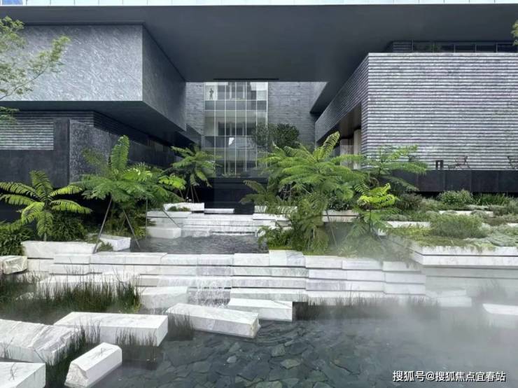 踏入院子,顺水而归,稍远处的立体会客厅与树木相互掩映,瀑布水景自空中倾泻下来,逐级流动,慢慢汇聚成我们脚边的清潭,可观可触可游,营造出沉浸式的山水之境。,移步换影间听闻到潺潺水声,像是自然的迎宾词。高低错落的树池植被精心搭配,打造出灵动、宁静的景观空间,增加景观的层次感和观赏性。
