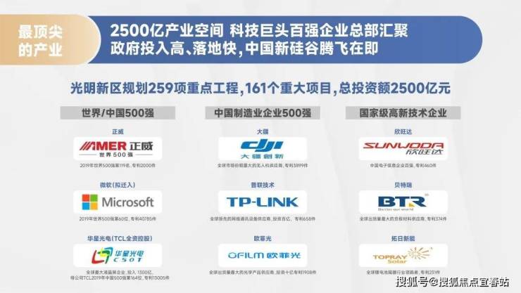 据2022年1月27日深圳市光明区人民政府印发的《光明区战略性新兴产业发展“十四五”规划》,力争至2025年打造3-5个百亿级平台引领型企业生态圈,百亿级龙头企业达7家、年产值超10亿元的企业超50家、上市企业数量超30家、省市级“专精特新”中小企业达100家、专精特新“小巨人”企业达18家、制造业单项冠军企业(产品)达7家。未来将集聚更多高精尖人才,高阶客群不愁租。