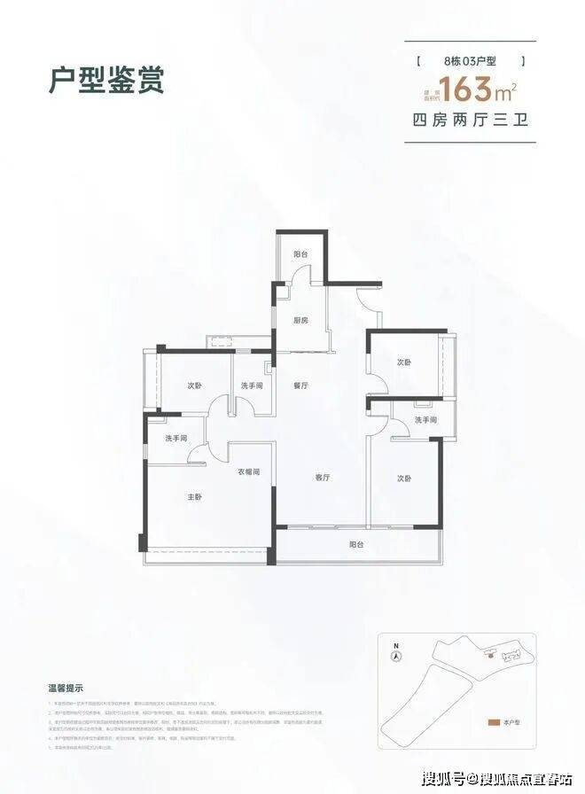 163㎡的4房2厅3卫,设计的是竖厅格局,一梯一户,进门入户玄关,LDKB一体化设计,三开间朝南,双主卧套房,客厅连接次卧出大阳台,L型厨房还带1个生活阳台,卫生间干湿分离,得房率约82%(不含赠送),东南朝向。