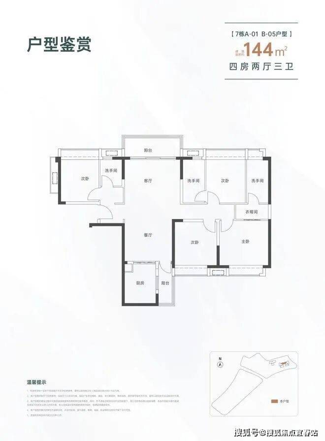 144㎡的4房2厅3卫,设计的是竖厅南北通透格局,进门入户玄关,LDKB一体化设计,双主卧套房,L型厨房还带1个生活阳台,公卫干湿分离,得房率约82%(不含赠送),阳台主朝西北向。