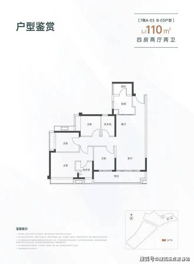 110㎡的4房2厅2卫,设计的是经典竖厅格局,进门入户玄关,LDKB一体化设计,四开间朝南,动静分区,客厅连接次卧出大阳台,L型厨房还带1个生活阳台,卫生间干湿分离,得房率约82%(不含赠送),东南朝向。