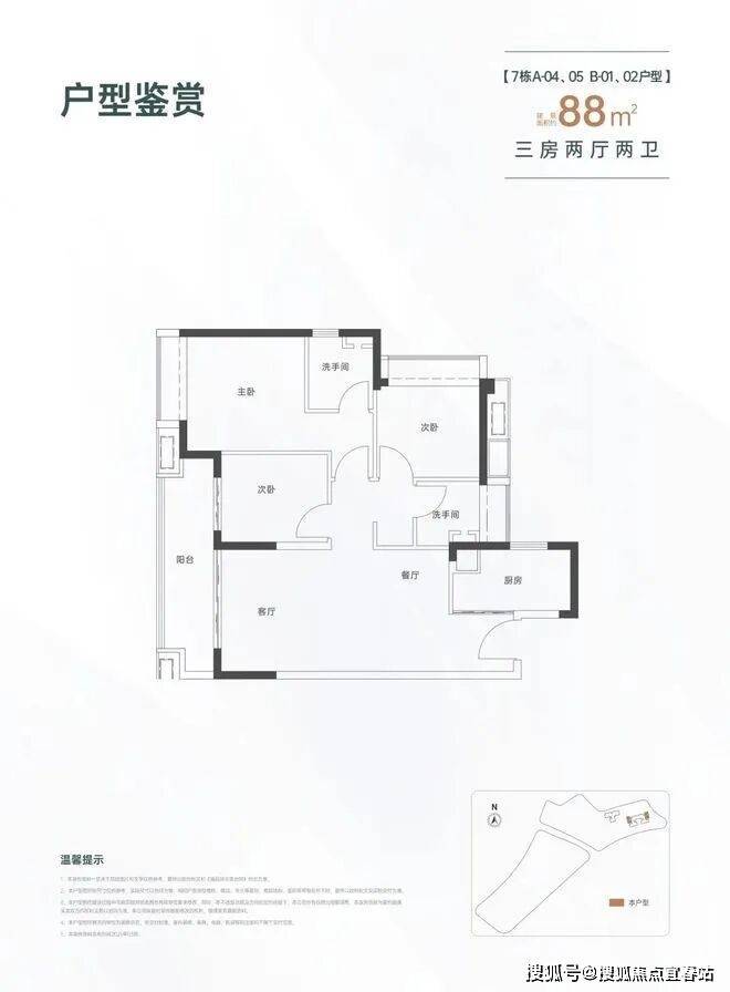 88㎡的3房2厅2卫,设计的是经典竖厅格局,进门入户玄关,LDKB一体化设计,动静分区,客厅连接次卧出大阳台,L型厨房,公卫三段式分离,得房率约82%(不含赠送),西南或东北朝向。